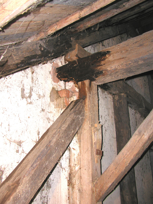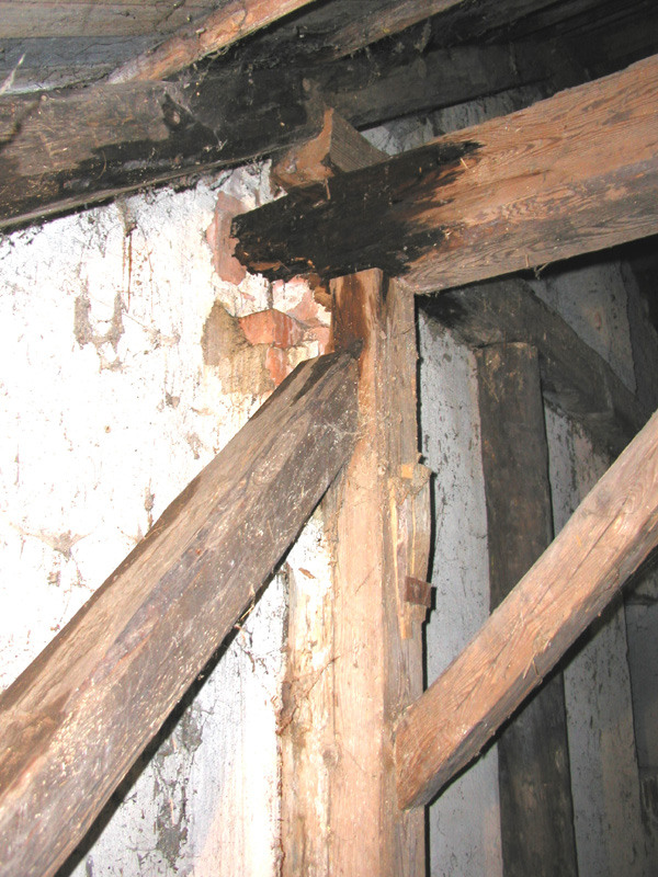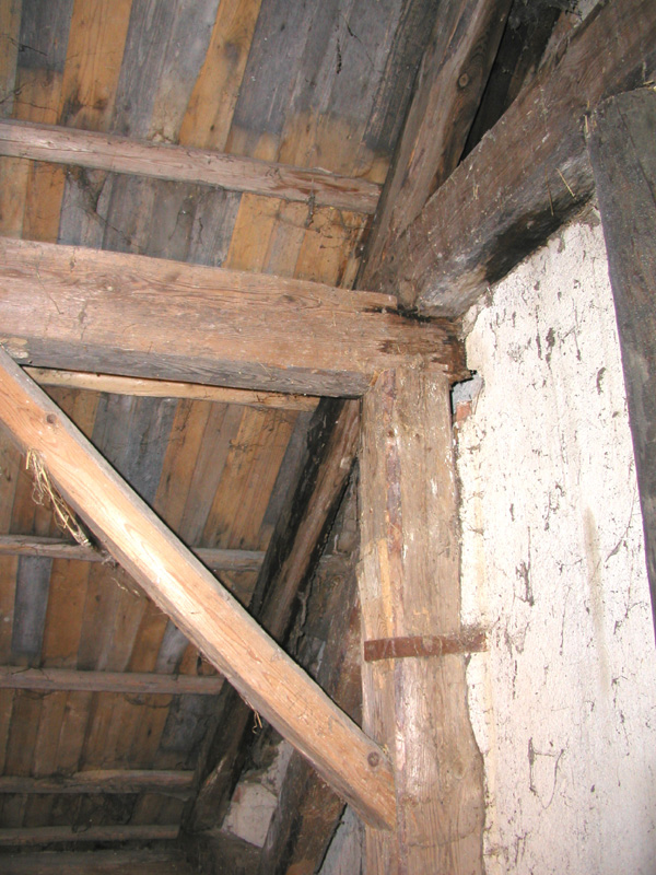 Kulatý sloupek pod hambalkem, který je vidět vzadu, je okamžité provizorní opatření provedené na moje doporučení, aby byla podepřena krokev hambalkem a odlehčilo se přetížené obvodové zdi. Další navržený postup byl následující: Oprava střešní krytiny, aby se zamezilo zatékání a dalšímu poškození krovu, oprava vazby krovu (výměna části střední vaznice a vazného trámu), sevření krokví v plné vazbě táhlem a nakonec oprava trhlin ve štítové zdi.